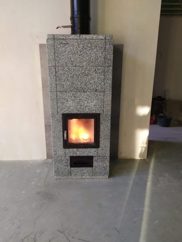 Облицовка камина выполнена из нового материала - экотальк, который по плотности и теплоёмкости практически не уступает природному камню.