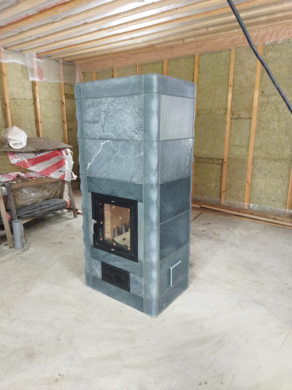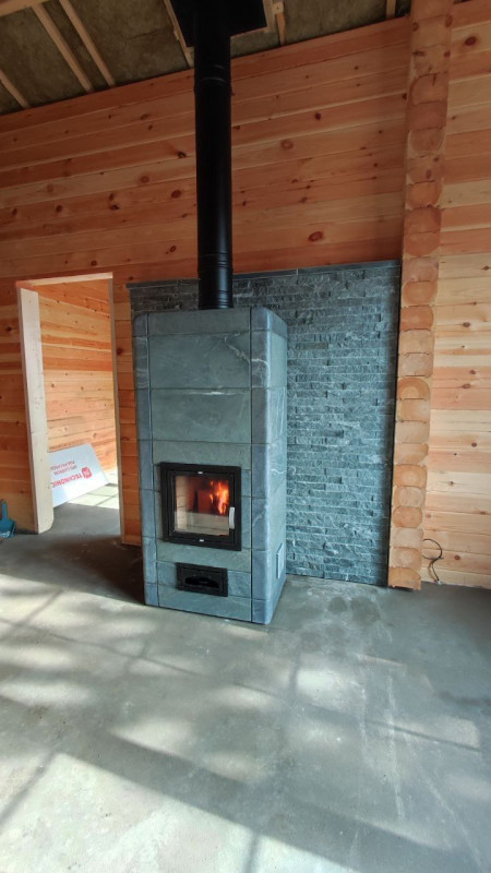 Облицовка этой модели выполнена из натурального талькохлорита, который аккумулирует тепло и медленно отдает его в помещение. Благодаря этому и противоточной системе каналов камин быстро набирает и долго отдаёт тепло.