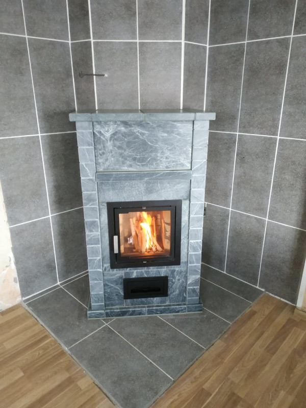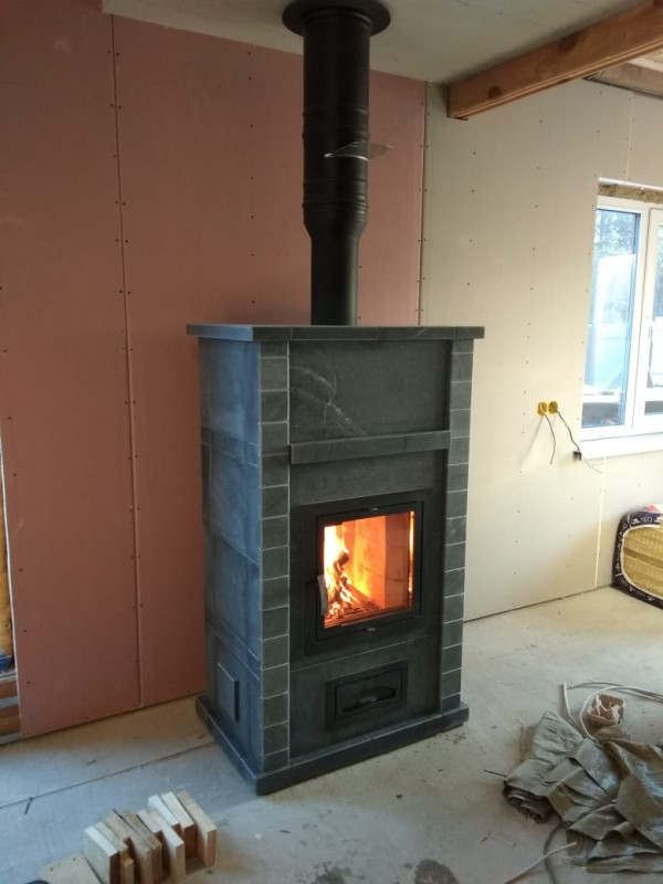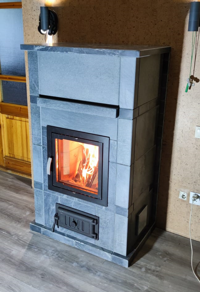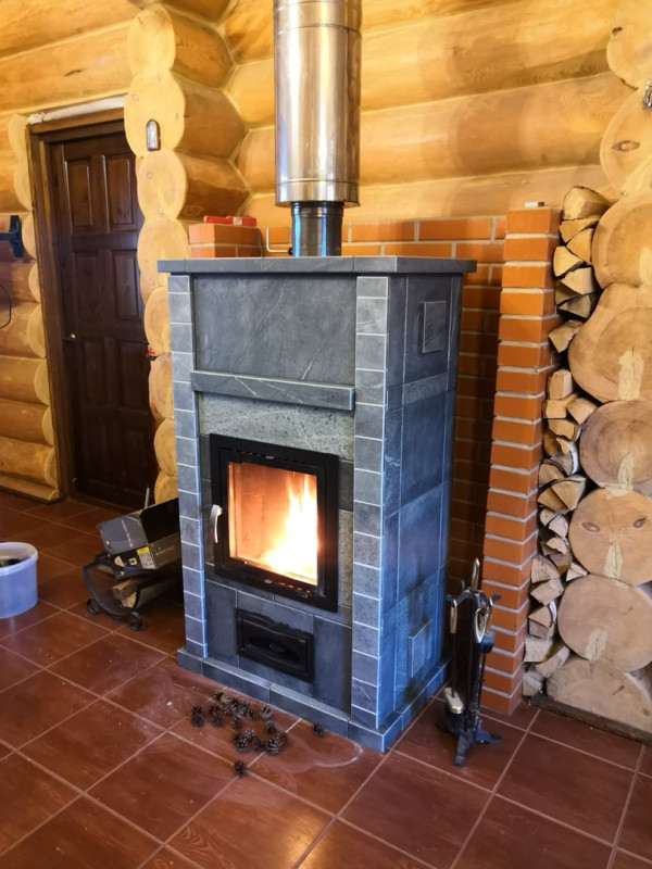 Облицовка выполнена из талькохлорита, который аккумулирует тепло и медленно отдает его в помещение.