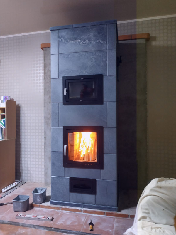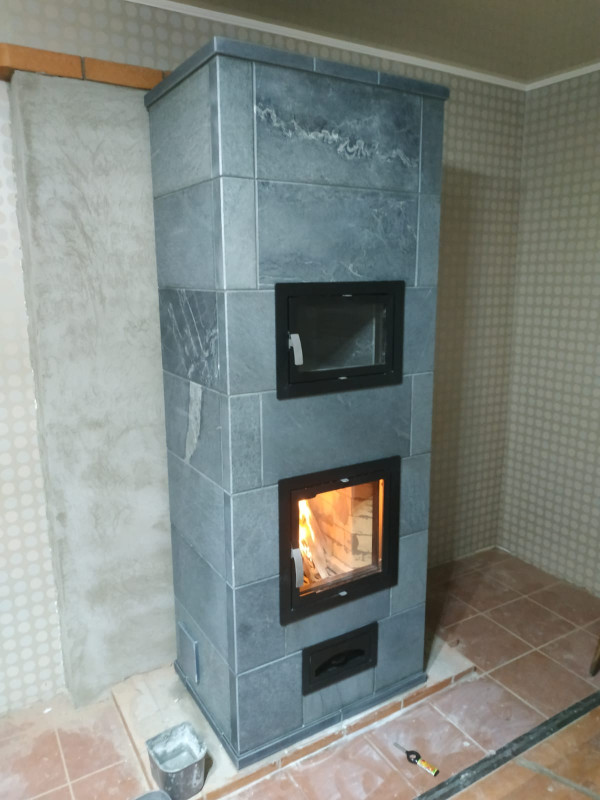 Облицовка камина выполнена из натурального талькохлорита. Печь оснащена духовкой из талькохлорита, которая нагревается до 300С.